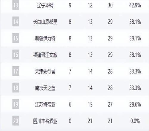 辽宁队作为四冠王,战绩滑落至9胜12负,排名跌至第13位,赛季表现远低于预期。福建队新疆队吉林队同为8胜13负,陷入中游泥潭。同曦队(7胜14负)、天津队(6胜15负)、江苏队(5胜16负)与四川队(0胜21负)则深陷倒数深渊,其中四川队已遭遇21连败,创CBA历史最差开局纪录。