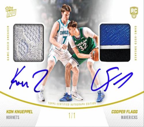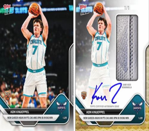 · 单人纪录版本:除了双签卡,Topps Now还同步发行了两人的单人版本卡片,分别记录弗拉格的生涯新高49分(青少年历史纪录)与克努佩尔的生涯新高34分(黄蜂新秀三分纪录)。单人版同样包含实物签字新秀卡的随机插放,发送给幸运的订单。